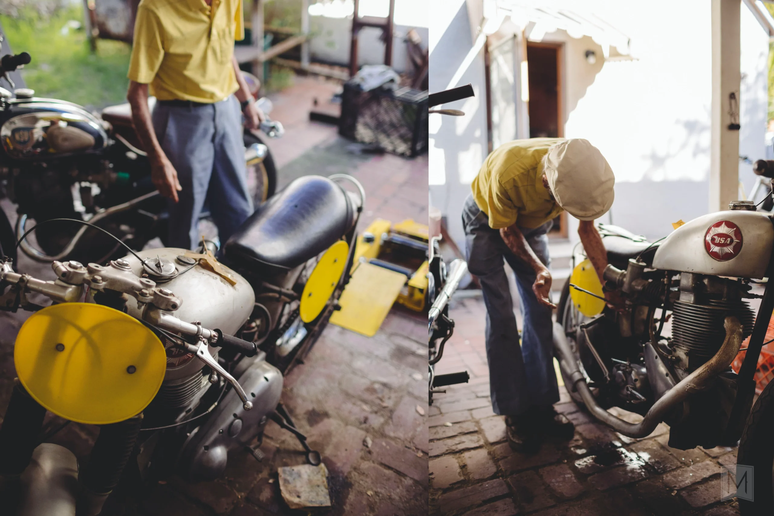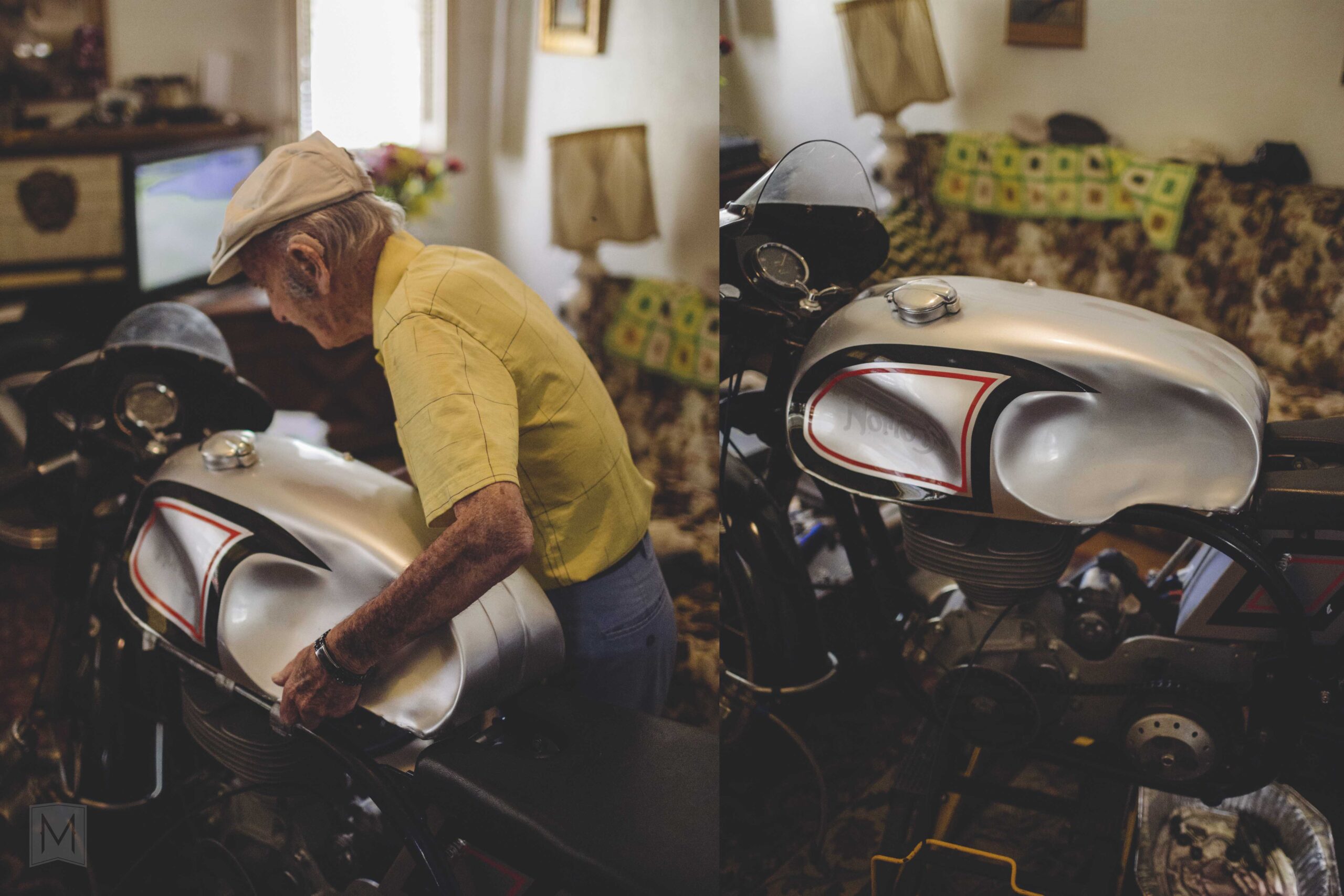 I met Gerry at Deus in Venice during the Festival of Thump event last March. I was taking pictures of a factory works Norton Manx when I heard an Englishman say “that’s me in that picture”, pointing to a framed photograph leaning against the rear wheel of the Norton. The picture, which had at first seemed to me like one taken from a history book, was really a shot of Gerry on his bike during his younger days racing in the Isle of Man TT. I have seen a few factory Manx before, even seen them being raced a few times, but this was my first time meeting an actual TT racer who had raced a Manx in its time. Turned out that he successfully raced the Manx and several other bikes still in his possession. He competed in three Isle of Man TT races in ’47, ’48, and ’52.