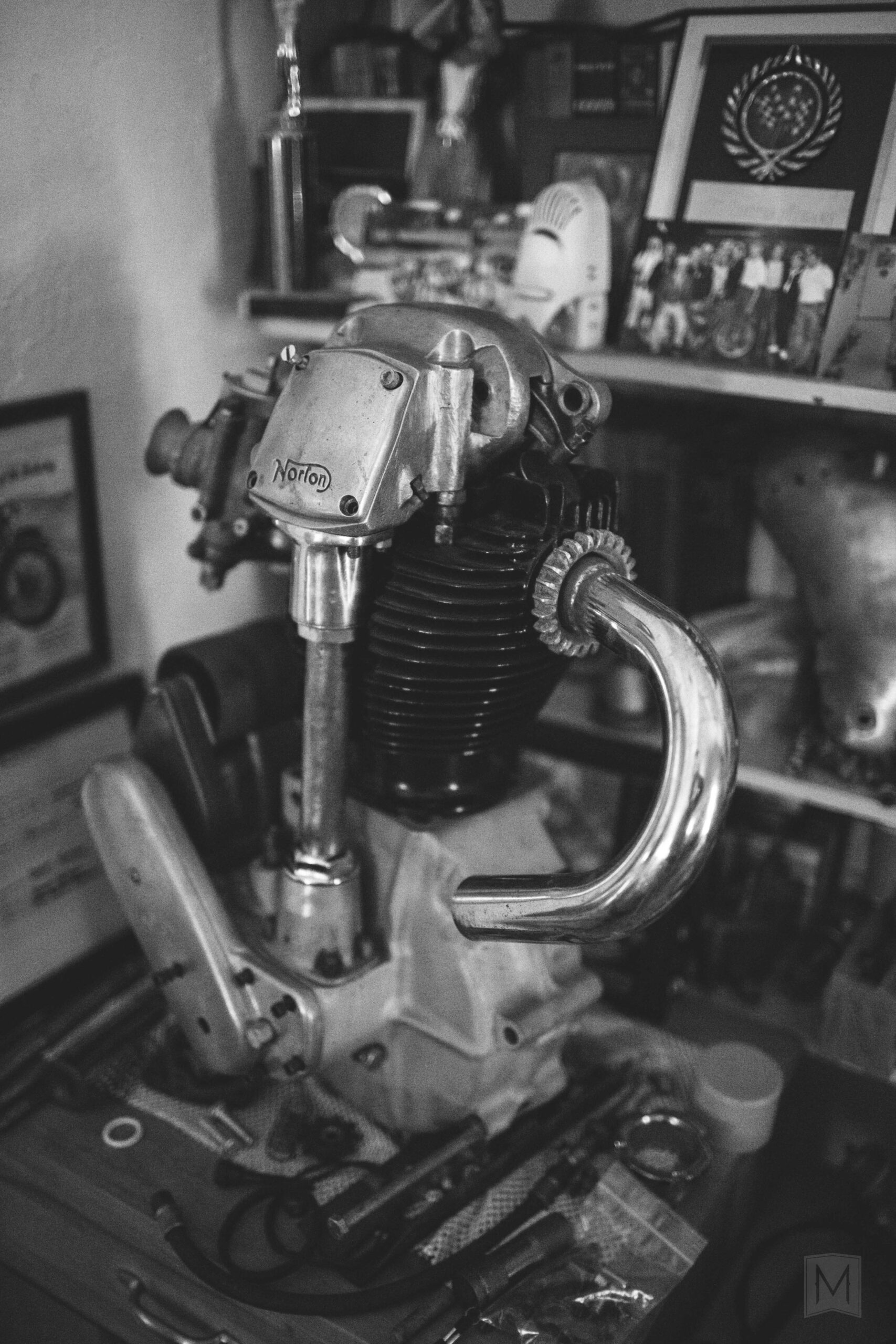 We talked for a few minutes and I knew that Gerry had more stories to tell so I got his information and a week later I was on his doorstep. Gerry was on his couch watching golf while building a Norton Manx in his living room. Parts of the Norton motor were arranged around him as if he were performing surgery. Six bikes were in his living room altogether. At this point I wasn’t quite sure what I had walked into.