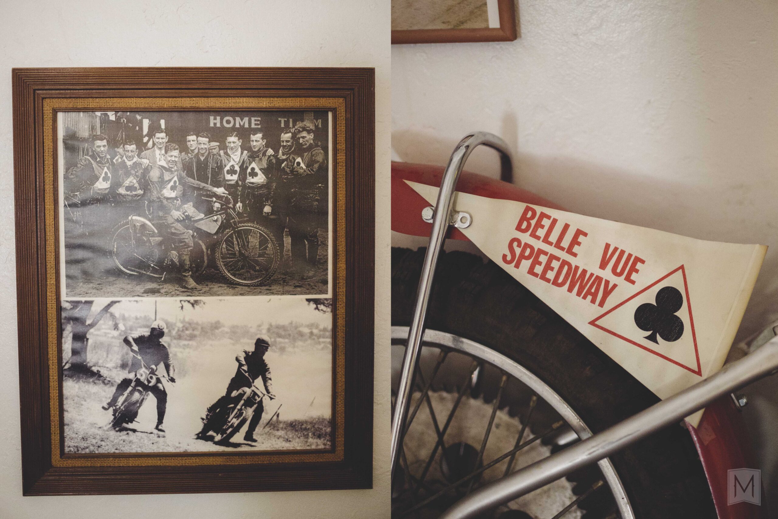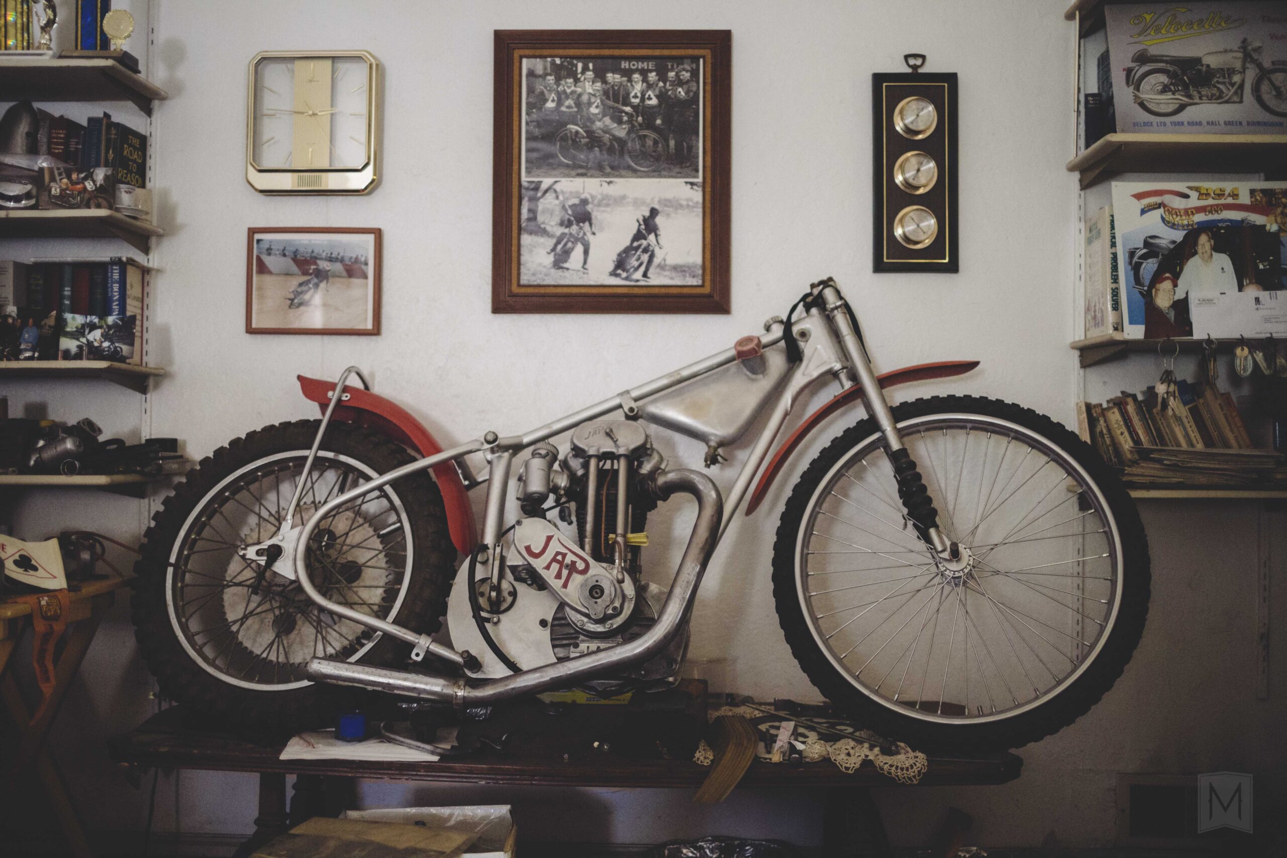 He showed me around the house and everywhere I turned, there were more bikes and memorabilia from his past. A wall where an old J.A.P. speedway bike leaned was arranged with trophies and ribbons of his achievements.